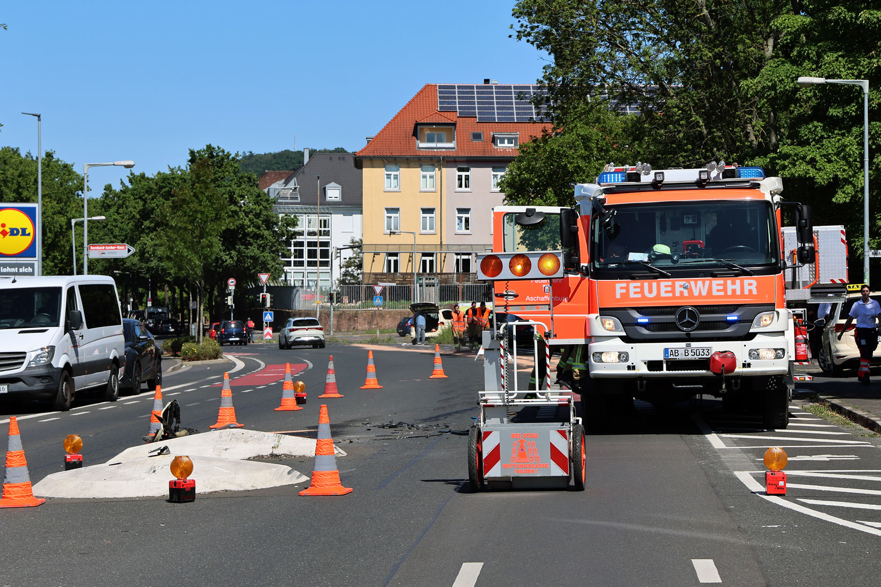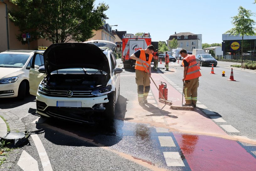 Die Feuerwehr Aschaffenburg sicherte die Unfallstelle ab, reinigte die Fahrbahn und beseitigte ausgelaufene Betriebsstoffe.