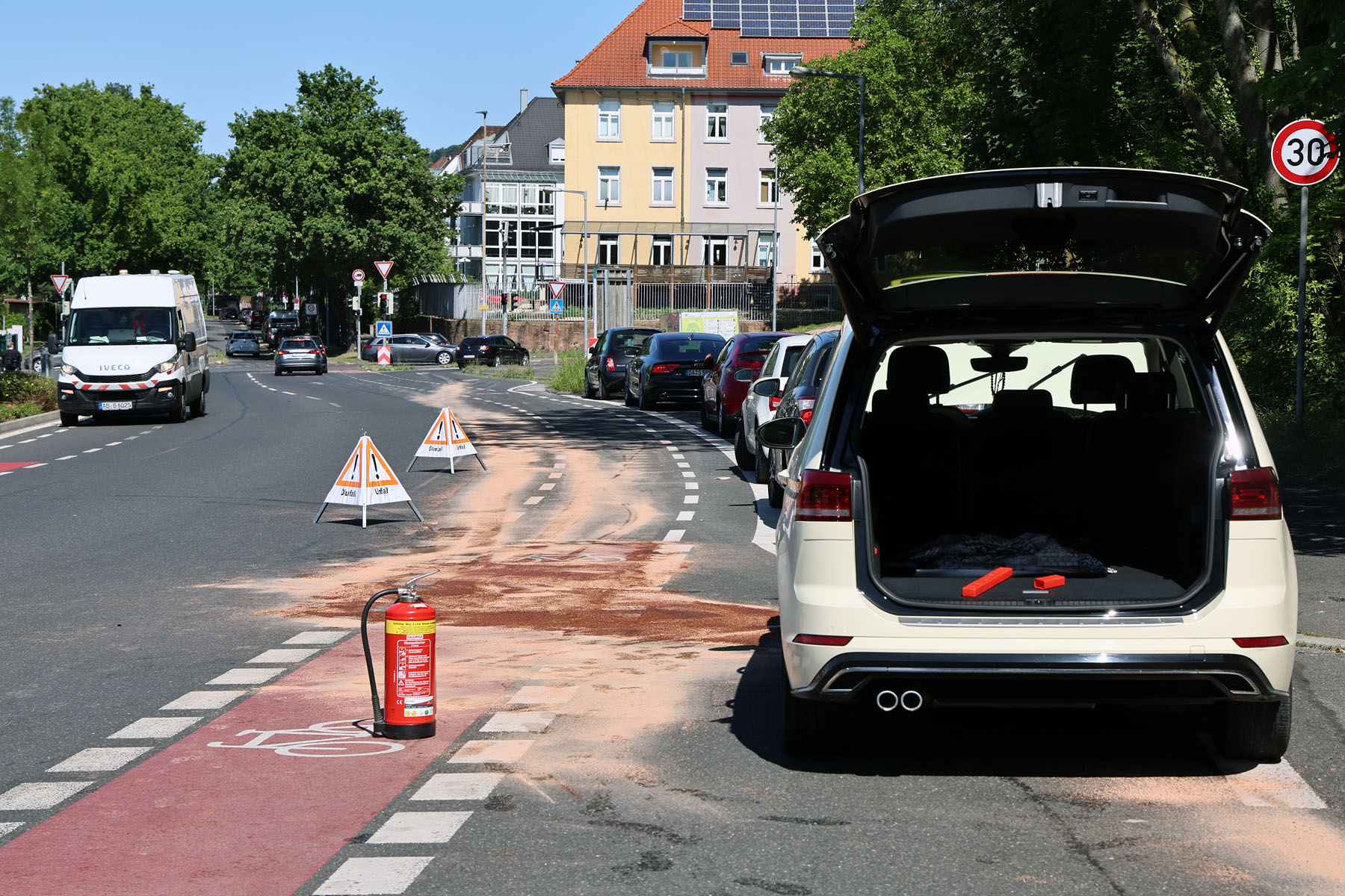 Zu einer Fahrbahnreinigung nach einem Verkehrsunfall musste die Aschaffenburger Feuerwehr in die Spessartstraße ausrücken.