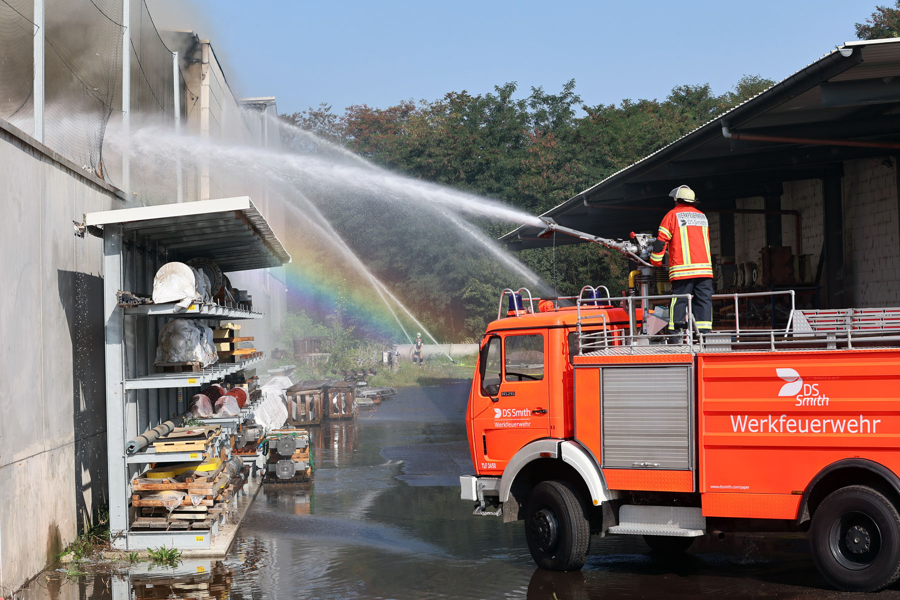 Mit mehreren Strahlrohren, Wenderohren und Wasserwerfern gingen die Feuerwehrkräfte vor. Schnell reagierte auch die Werksfeuerwerk des benachbarten Papierherstellers. Diese baute sofort eine Riegelstellung zum eigenen Betriebsgelände auf.