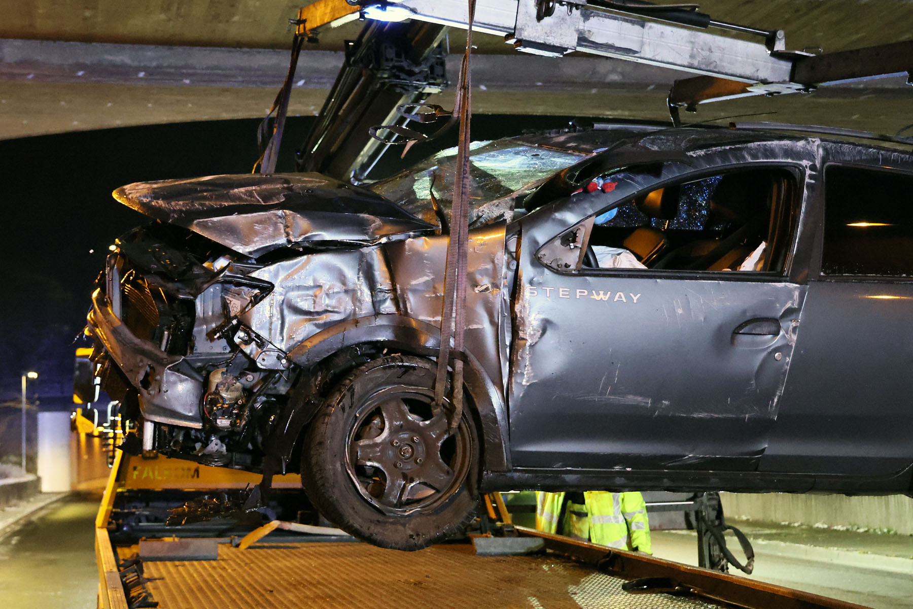 Am Dacia entstand wirtschaftlicher Totalschaden – er musste von einem Abschleppunternehmen mit einem Kran geborgen werden.