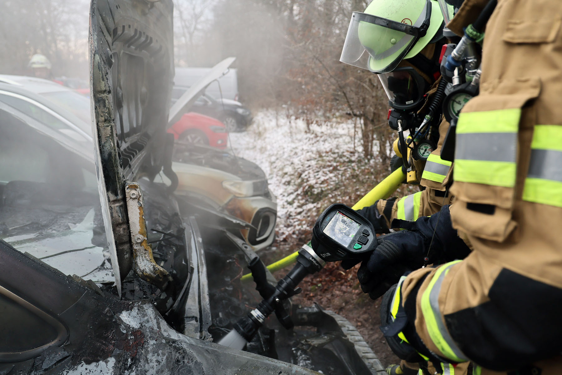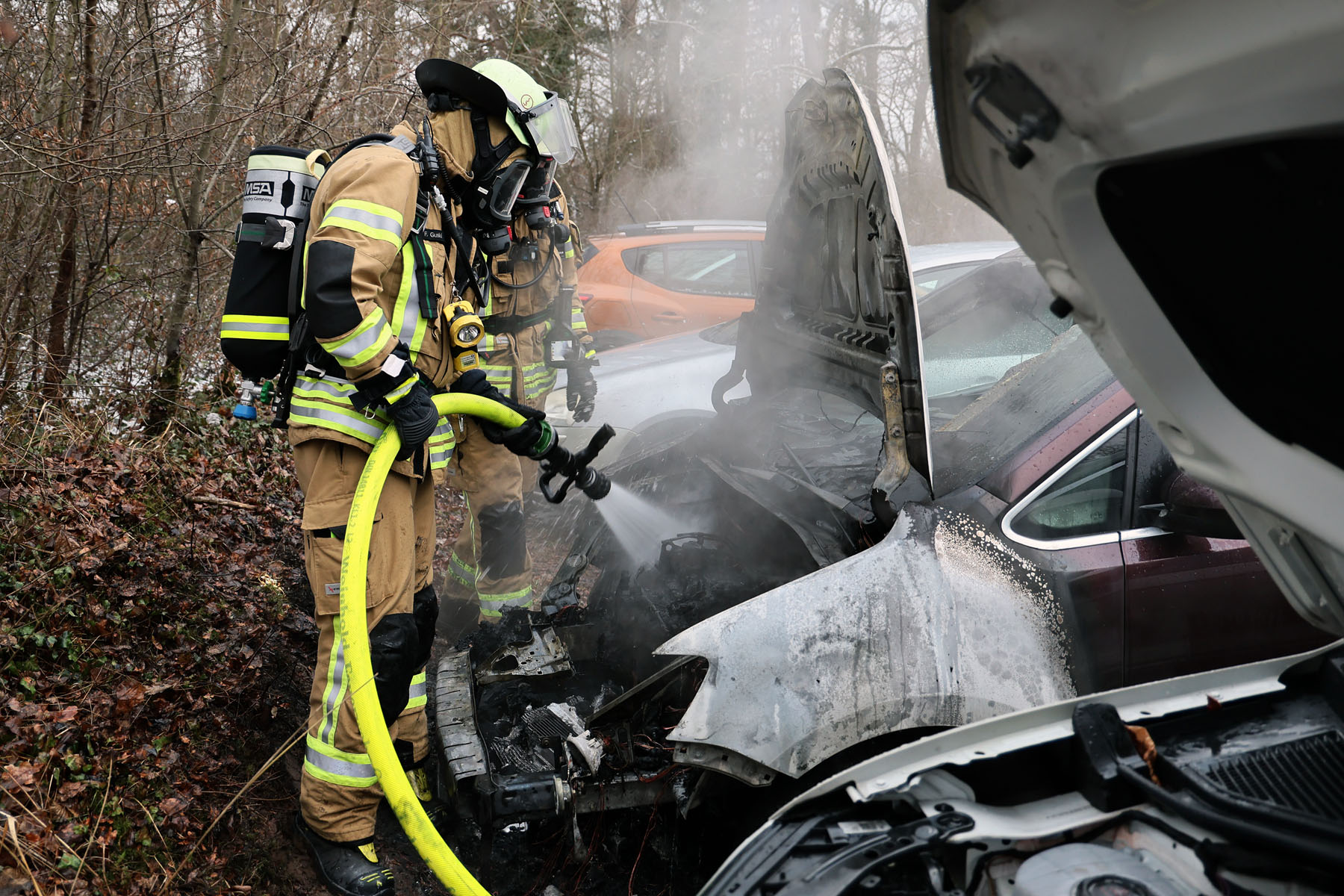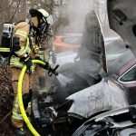 Als die Einsatzkräfte eintrafen, brannte bereits der komplette Motorraum des Fahrzeugs und das Feuer hatte begonnen auf den Innenraum überzugreifen.