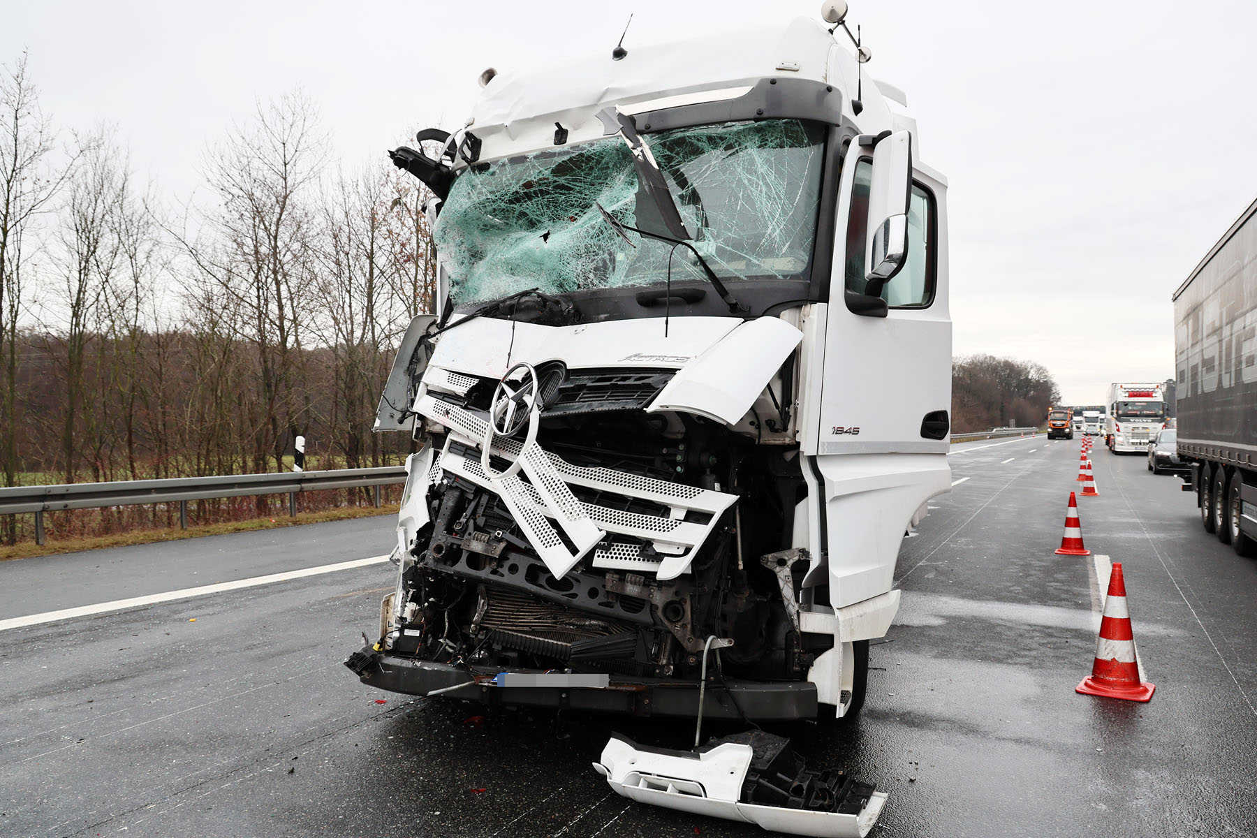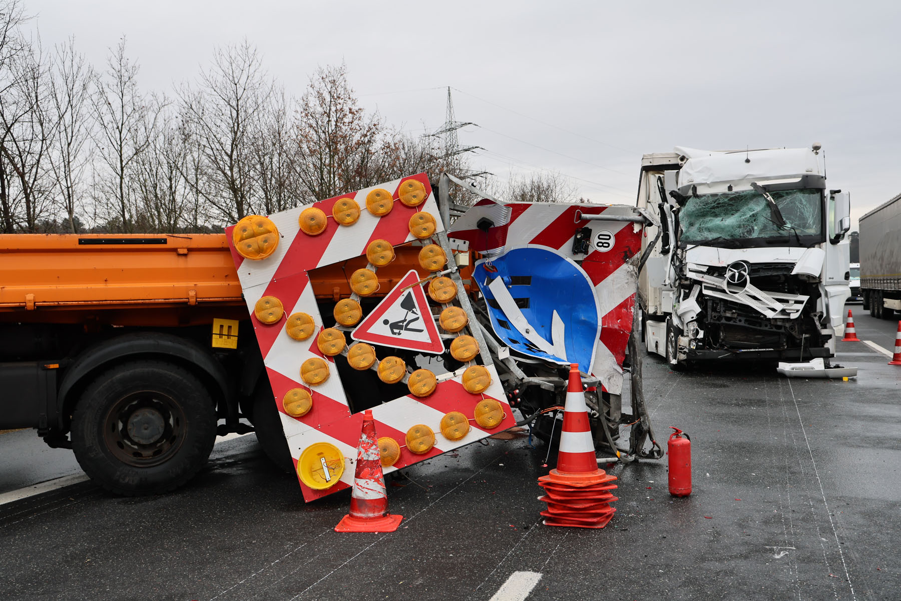 Ein Richtung Frankfurt fahrender 59-jähriger Sattelzug-Fahrer erkannte die Situation vermutlich zu spät. Er versuchte vermutlich noch im letzten Moment auszuweichen, prallte jedoch mit großer Wucht in den Verkehrssicherungsanhänger, wodurch dieser komplett zerstört wurde. Der den Anhänger ziehende LKW wurde durch die Wucht des Zusammenstoßes in die Leitplanke geschoben.