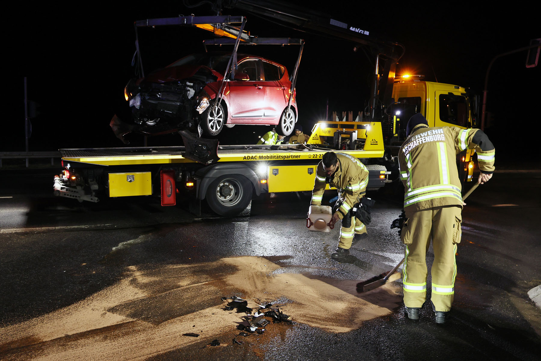 Die Feuerwehr Aschaffenburg sicherte die Unfallstelle ab, leuchtete diese aus und reinigte die Fahrbahn.