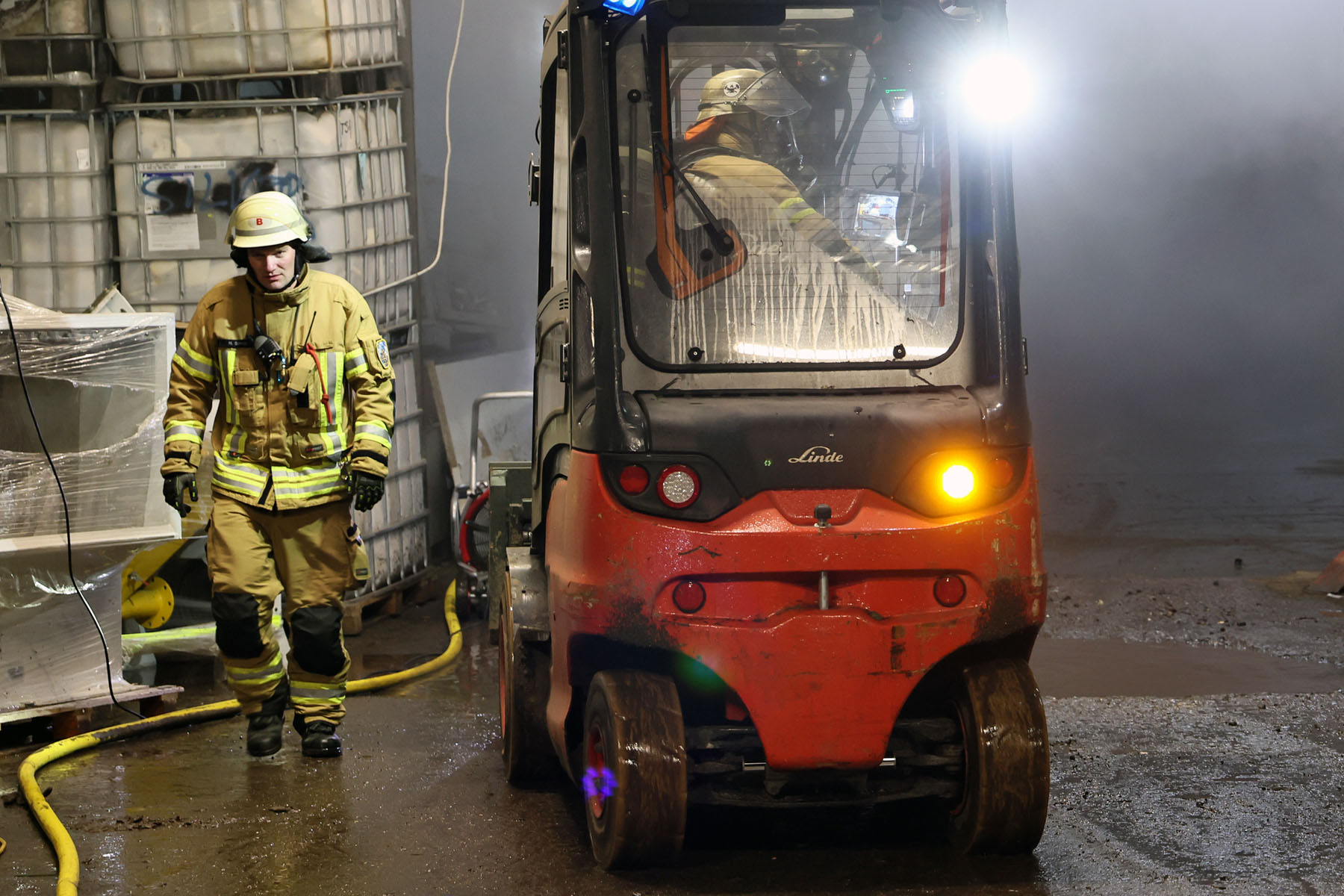 Die Einsatzkräfte gingen unter Atemschutz vor, lokalisierten den Brandherd und konnten das Feuer schließlich ablöschen. Um den Rauch aus der Halle zu entfernen, wurde ein Großraumlüfter eingesetzt.